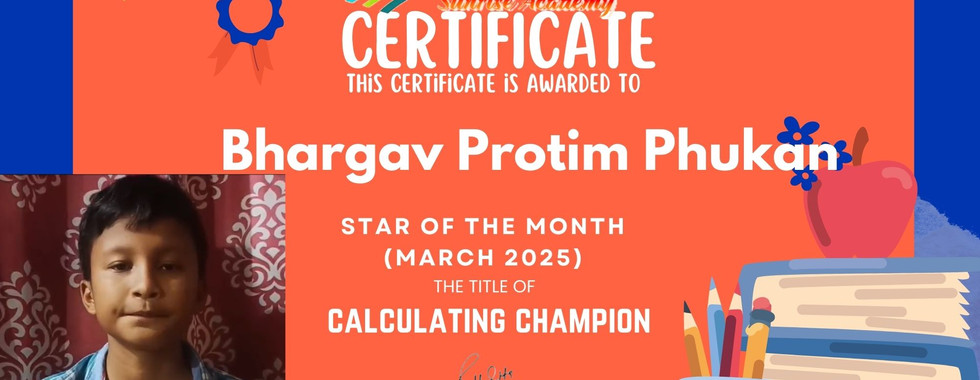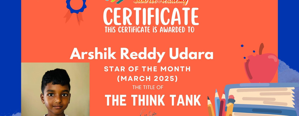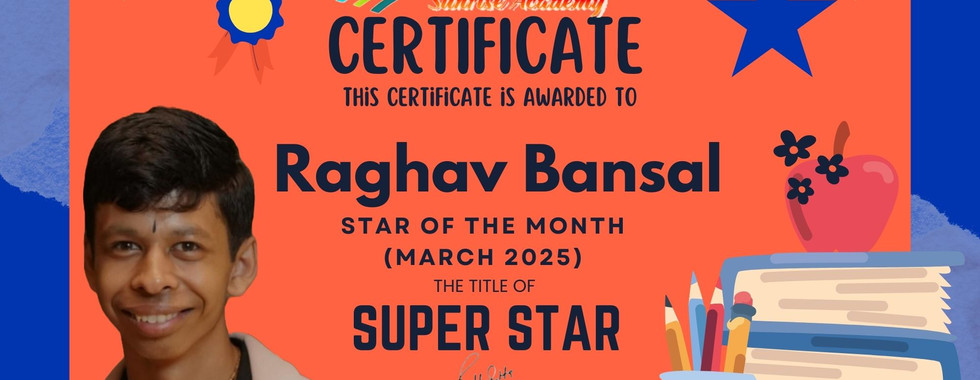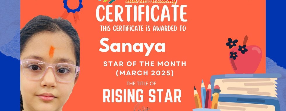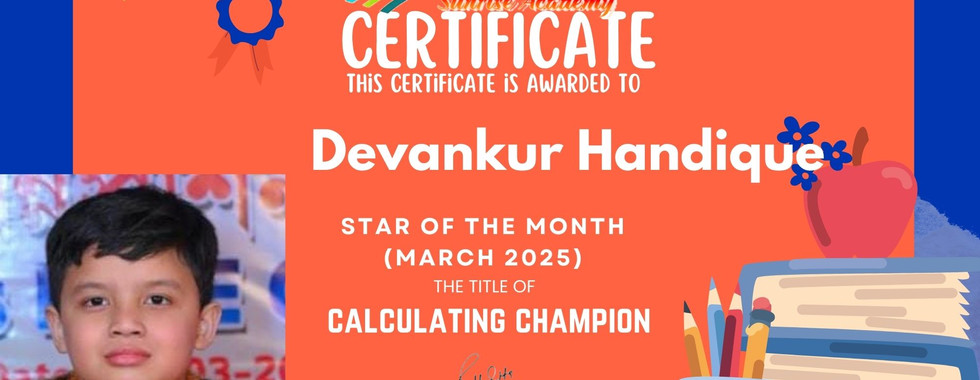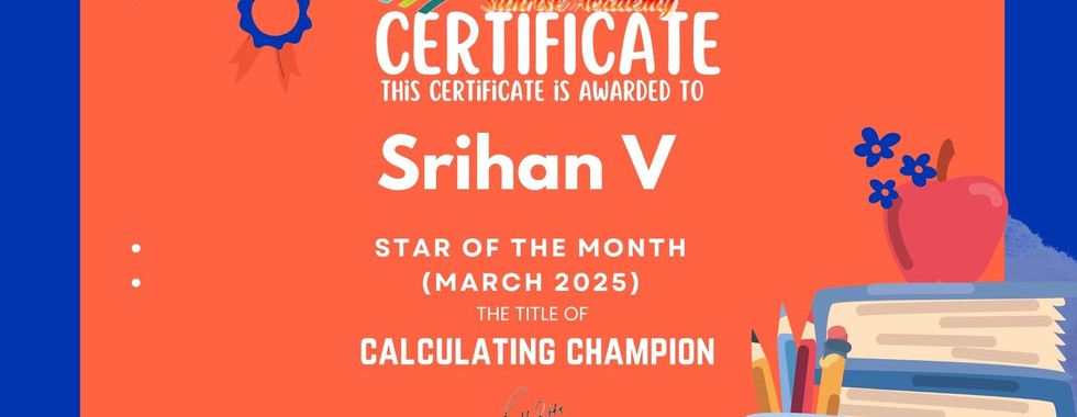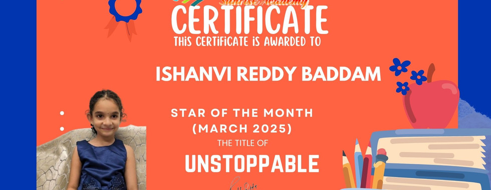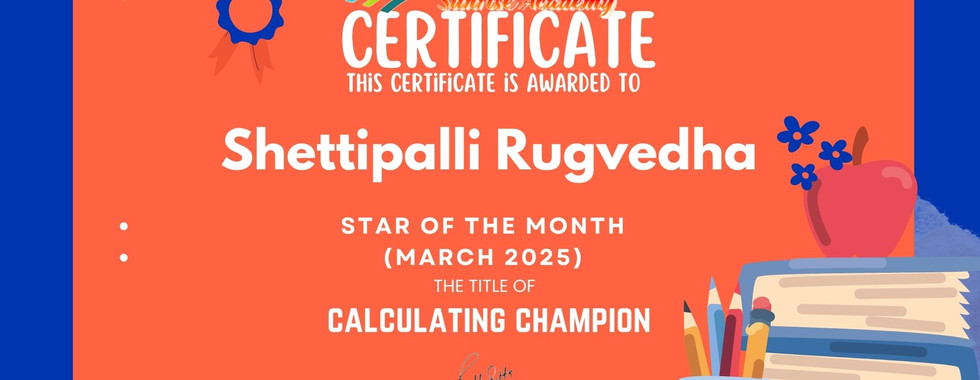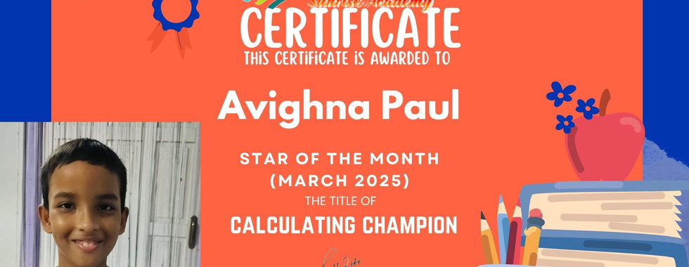 At RYG Sunrise Academy, we celebrate the achievements of our outstanding students who excel in Abacus and Vedic Maths. Each month, we highlight a remarkable individual whose dedication, hard work, and passion for mathematics inspire their peers. In March 2025, we are excited to announce our "Star of the Month," showcasing the high standards of our training programs.